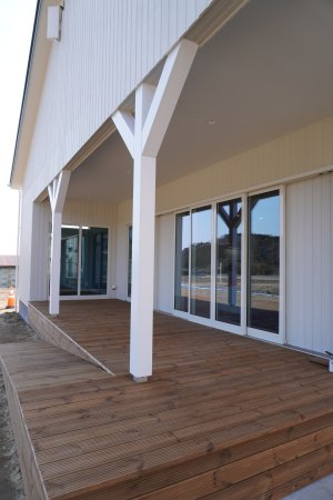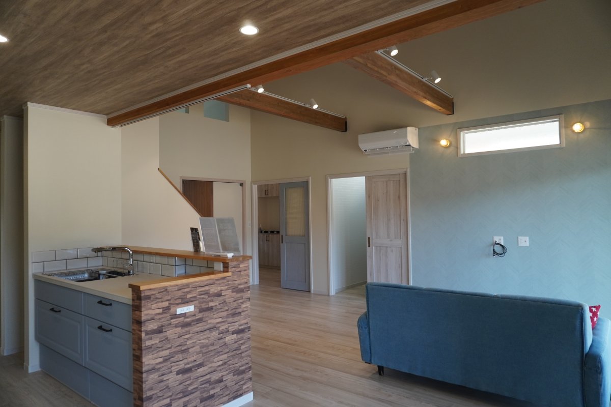 アウトドア気分を満喫できるLDKに隣接されたウッドデッキのある家