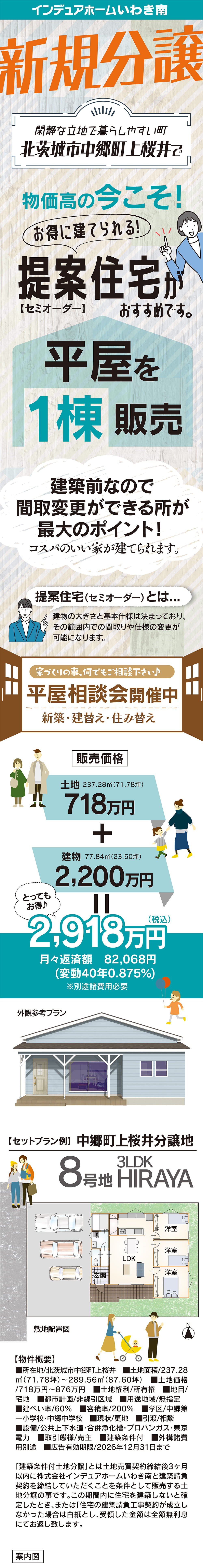 新規分譲!閑静な立地で暮らしやすい町、北茨城市中郷町上桜井で提案住宅(セミオーダー)の平屋を1棟販売致します。価格高騰の中、自由度が高く、コスパもいい家が建てられます。